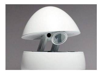 机器人头顶的红色警报器不停旋转着,接着从它三分之一的位置处裂开,露出了一根黑色圆形的柱子,机器人迅速地变形成由圆形柱子支撑的两个大小不一的半球形,向上的部分延伸成一朵漆黑的蘑菇,向下部分演变成一个环形吧台,过了大约五秒钟,机器人中间的黑色圆柱形柱子上突然睁开了一双白色的眼睛。眼睛向着吧台方向迸出了一道蓝光后,瞬间在吧台上方,蘑菇伞的下方,生成了一个蓝色的全息影像,接着一个极具磁性的男声从环形吧台面上其中一个播放器出传出。